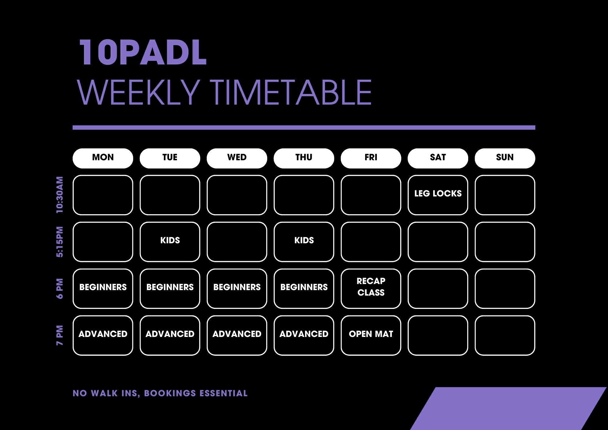| | BeginnersMonday to Friday | 6 PM to 7 PM AdvancedMonday to Friday | 7 PM to 9 PM Leg Locks ClassSaturday | 10:30 AM to 11:45 AM Kids classTuesdays & Thursdays | 5:15 PM to 6 PM Private LessonsAvailable on request at additional cost |